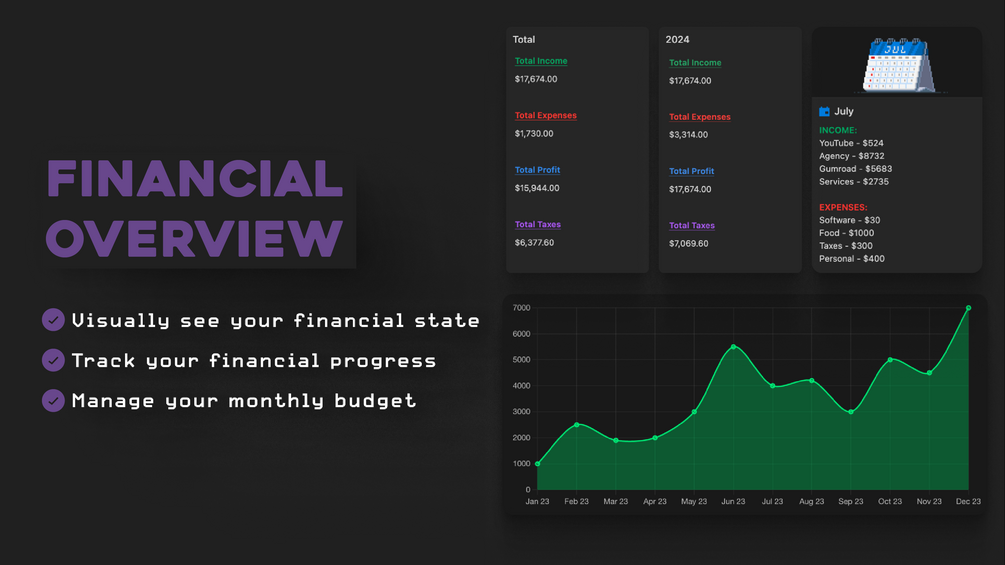 It will visually show your yearly income, expenses, profit and taxes alongside a dynamic line chart